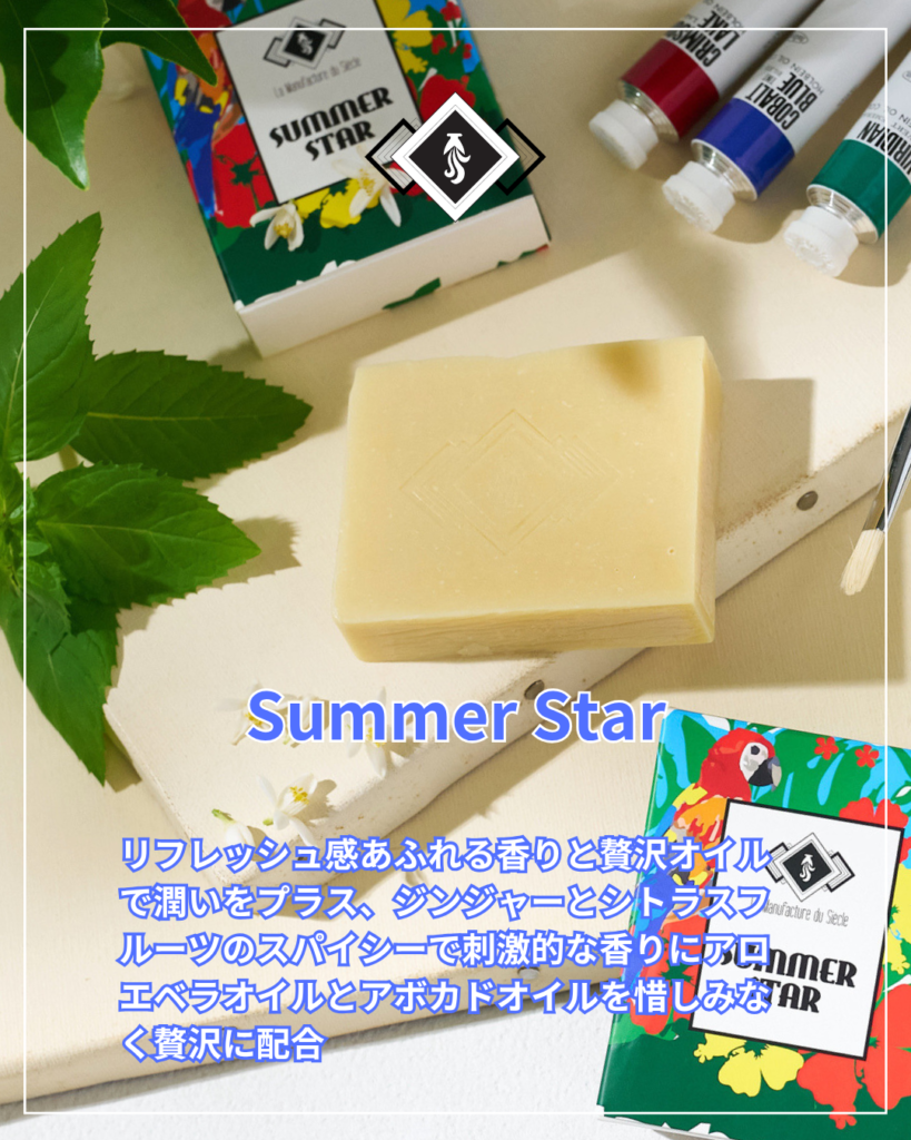 今回のBlog記事の冒頭の画像で取り上げているSummer Starを紹介させていただきます。夏に限定した製品ではありませんが、アロエベラオイルとアボカドオイルを惜しみなく使い、ジンジャーとシトラスフルーツの少々スパイシーで刺激的な香りに仕上げた石けんです。